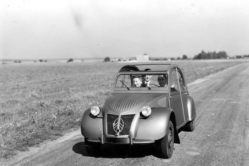 The Citroën 2CV (or “deux chevaux” i.e. “deux chevaux-vapeur [fiscaux]”, literally “two tax horsepower”) is considered one of Citroën’s most iconic cars. It was designed as an economy vehicle with uncompromisingly utilitarian unconventional looks. Originating with the Toute Petite Voiture project of 1936 under the visionary vice-president Pierre Boulanger, Citroën had certain guidelines for the car: it should carry two people, 50 kg of potatoes and a small barrel of wine, and use no more than 3 ℓ of fuel per 100 km. It should also be able to drive across a ploughed field without breaking a tray of eggs. Boulanger insisted that he be able to wear his hat inside the car, so the roofline was designed to accommodate it.