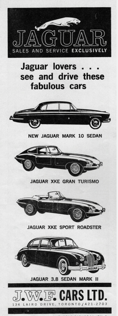 Around the same time that they closed Scarborough, they launched a new venture: J.W.F. Cars Ltd., located at 134 Laird Drive in Leaside, an affluent neighborhood in North Toronto (J.W.F. reflecting Jim’s initials). J.W.F. Cars Ltd. was marketed as, Toronto’s only exclusive Jaguar dealership.