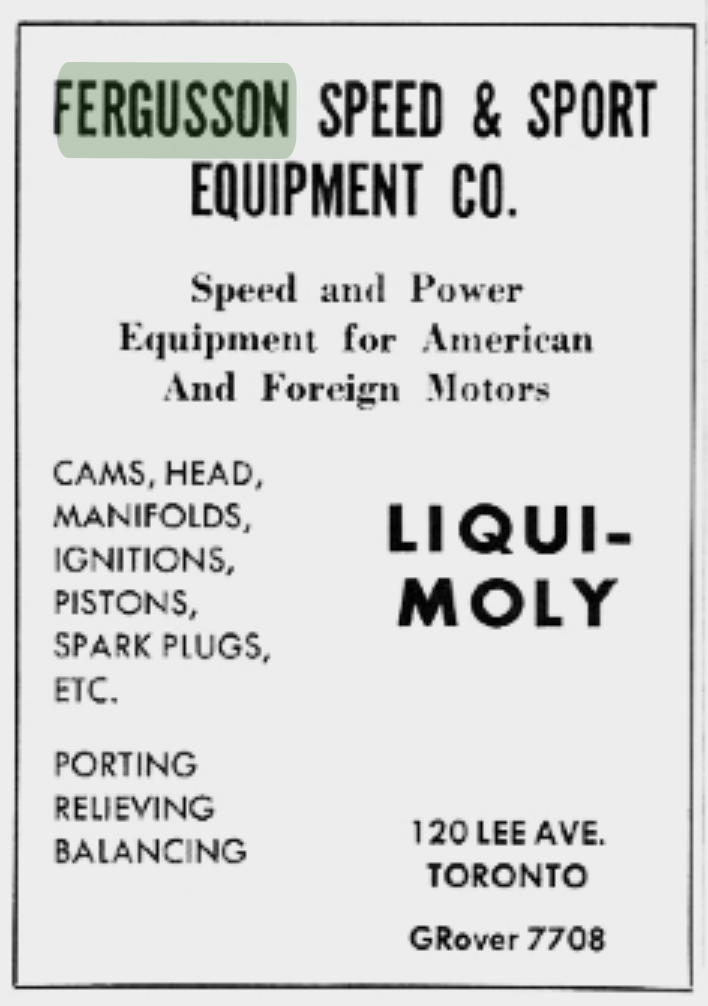 In addition to their dealership(s) and the speed shop, the Fergussons were involved in several smaller side ventures in the 1950s, including the operation of a body shop, located at 7 Dibble Street in Toronto.