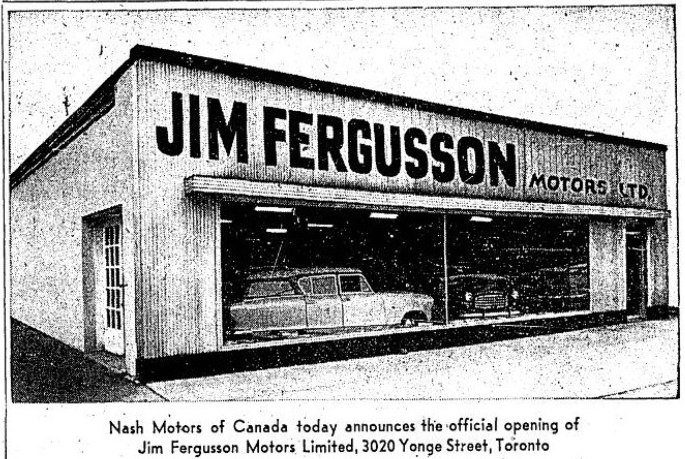 In May of 1955, the Fergussons expanded their operations by opening a second dealership at 3020 Yonge Street in Toronto, operating under the name Jim Fergusson Motors. For the next five years, Jim and Alice managed both the Yonge Street and Scarborough Beach locations concurrently. However, in late 1960, they closed the original Scarborough Beach Garage.
