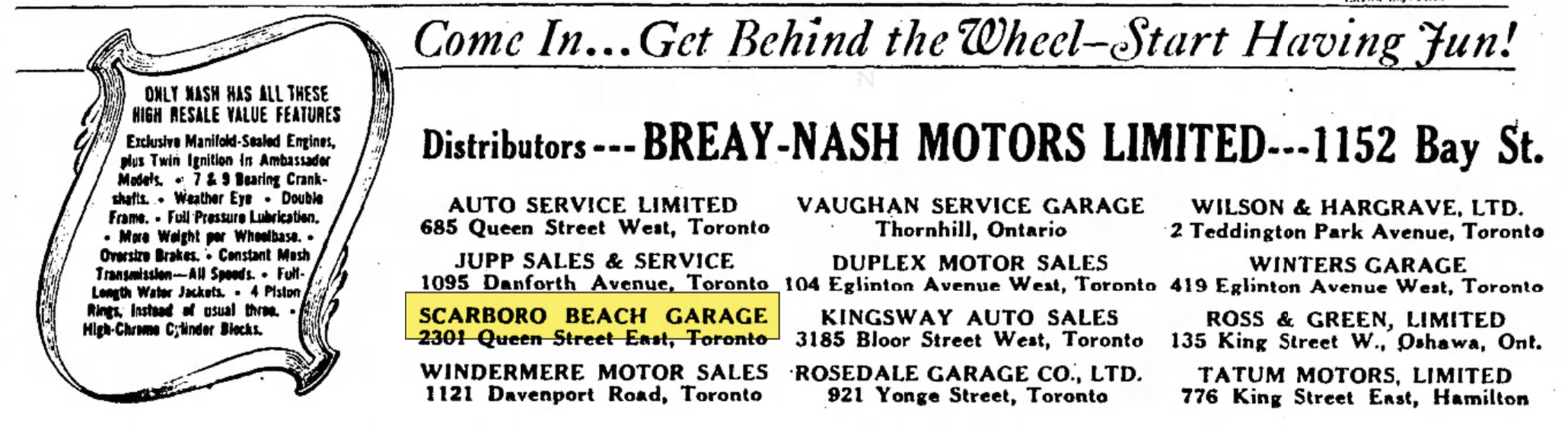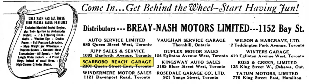 Jim and Alice’s experience running a car dealership began at the Scarborough Beach Garage, located at 2301 Queen Street East, in a suburb of Toronto. The spelling of the word Scarborough in the business name was inconsistent, appearing as both Scarboro Beach Garage and Scarborough Beach Garage. This caused some confusion trying to research this article, but I eventually came to discover that the shorter spelling variation was once common in the Toronto area and eventually fell out of favor.