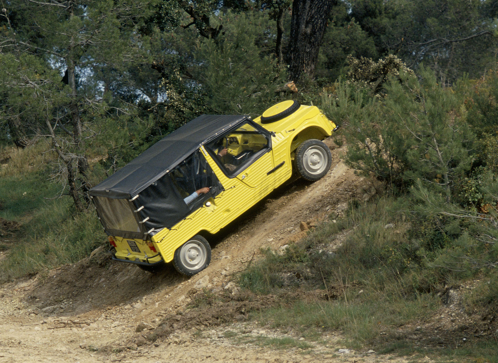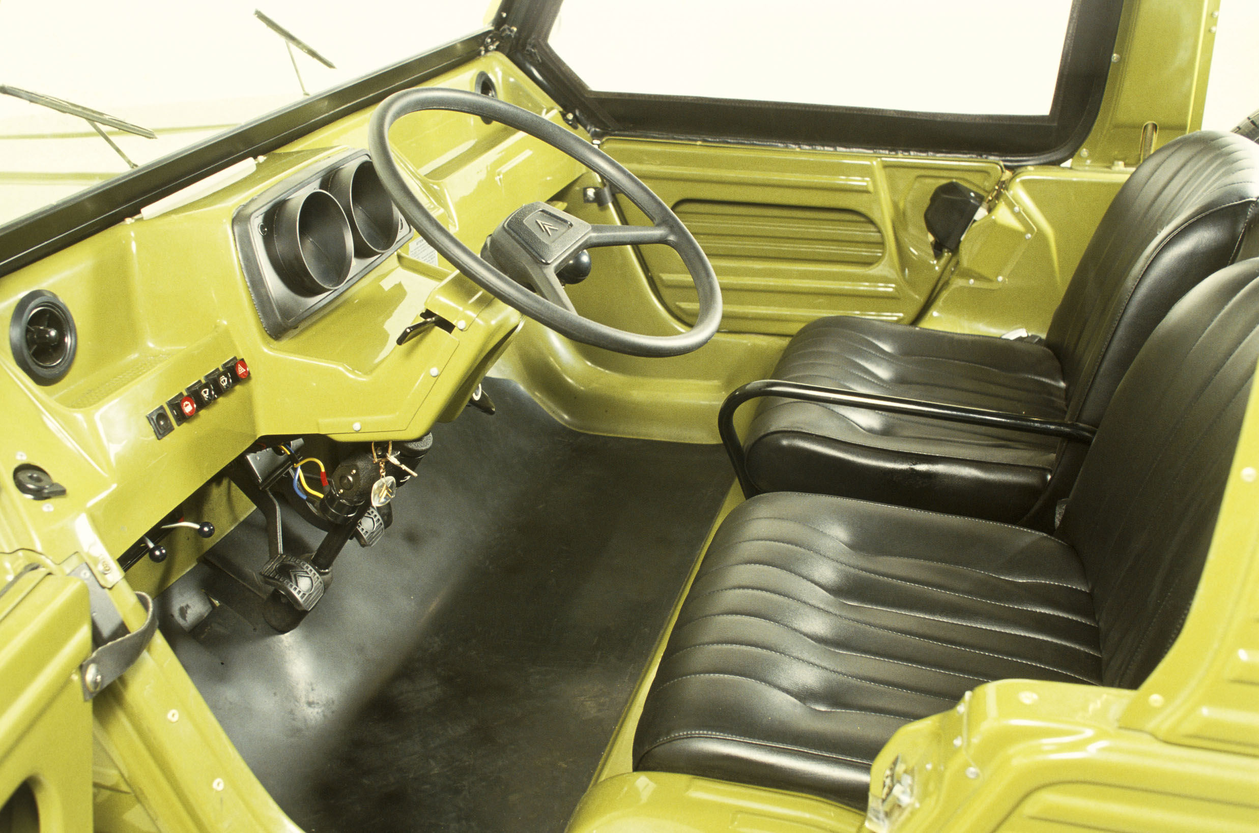 The Méhari was based on the Citroën Dyane 6, and has the interconnected fully independent long-travel 2CV suspension used by all of the Citroën ‘A-Series’ vehicles. Its body is ABS plastic material over a tubular frame that is attached to the Dyane chassis. Colour was integrated into the ABS, but tended to fade very quickly so that virtually every Mehari today looks either incredibly scruffy or has been repainted to give a fresh appearance. They come with a soft top that can be rolled up in a number of configurations or removed altogether.