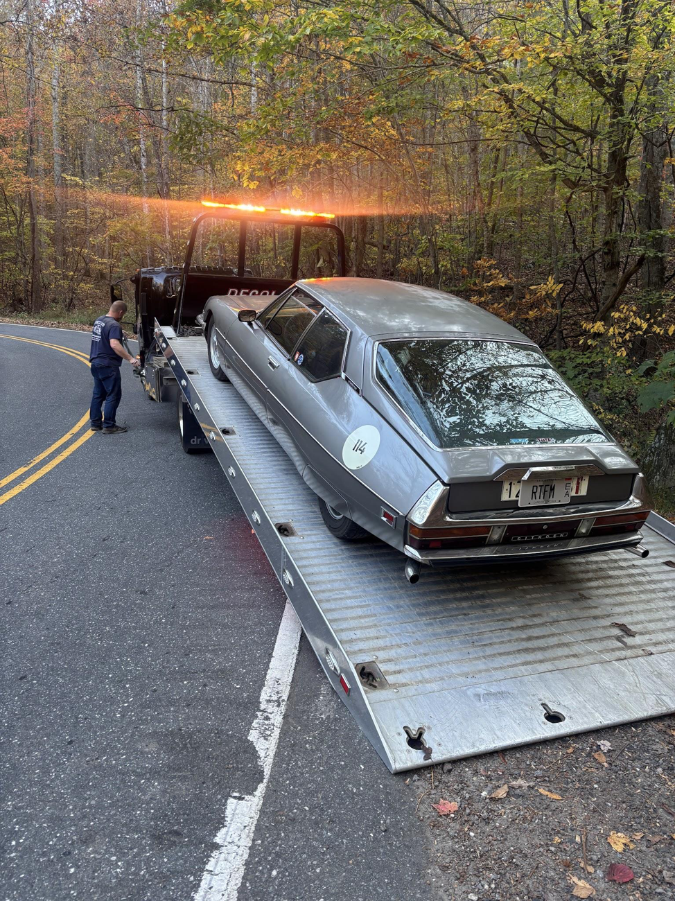 Consolation came in the form of the amazing support from fellow Overcrest drivers who stopped to assist. About 10-12 people stopped to help push the SM uphill a couple hundred yards to a safe turnout. Many other cars stopped to offer assistance and troubleshoot, but any attempts to repair the GM rotor failed, and after an hour of futzing about, I called a tow truck, insisting on something capable of a low profile car. The driver arrived within 30 minutes.