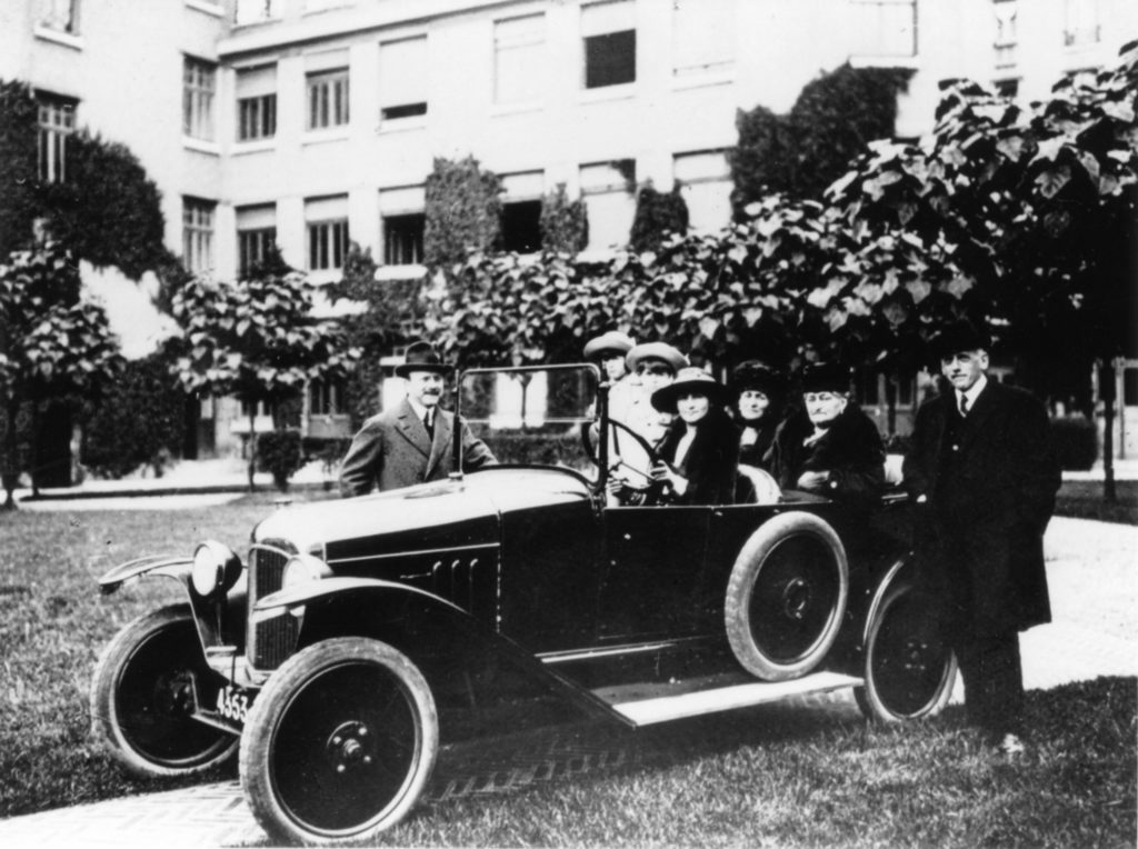 André Citroën (left) presents the 1919 “Type A” with his wife at the wheel, his children and his in-laws.